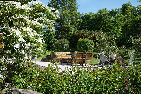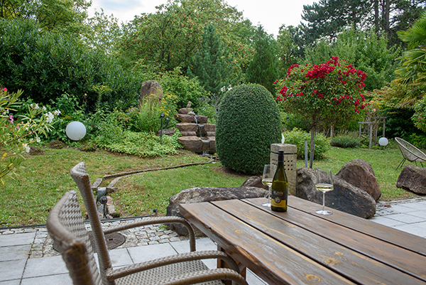 Hier fühlt man sich wohl! Ob in geselliger Runde bei einer guten Flasche Wein oder auch gemütlich zu zweit. Unsere großzügige, windgeschützte Sonnenterrasse ist der Treffpunkt unserer Hausgäste. Der offene Kamin und das Plätschern des Bachlaufs machen diesen Ort perfekt. Vor der Mittagssonne schützt Sie eine ausfahrbare Markise.